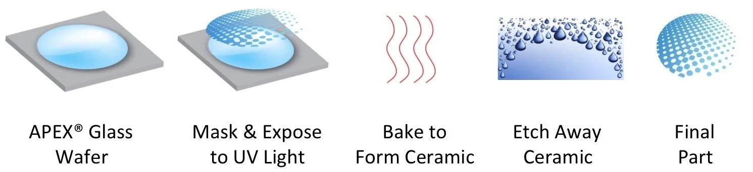 APEX® Glass is not like traditional glasses. It contains special sensitizers that allow unique anisotropic 3D features to be formed through a simple exposure step. This “photo-structurable glass” combines batch manufacturing processes with standard IC processing toolsets to provide a low-cost, high-volume, production solution.